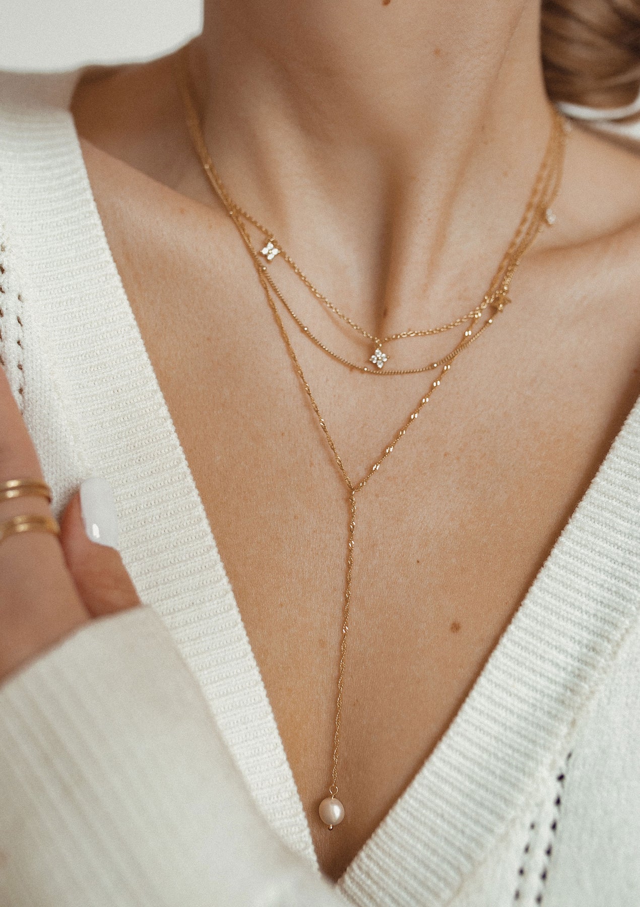 There are many possibilities to wear a lariat necklace. These pieces are so versatile and adaptable to any style. They look very discreet, but chic when styled with your outfit. You can layer them with another dainty necklace or a choker for a trendy and fashionable look. Many people like to combine them with other necklaces to get the full layering effect. They are very suitable for V-neck tops.