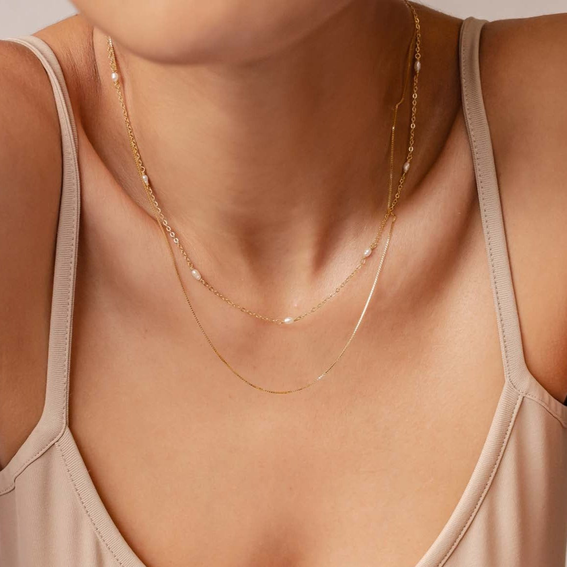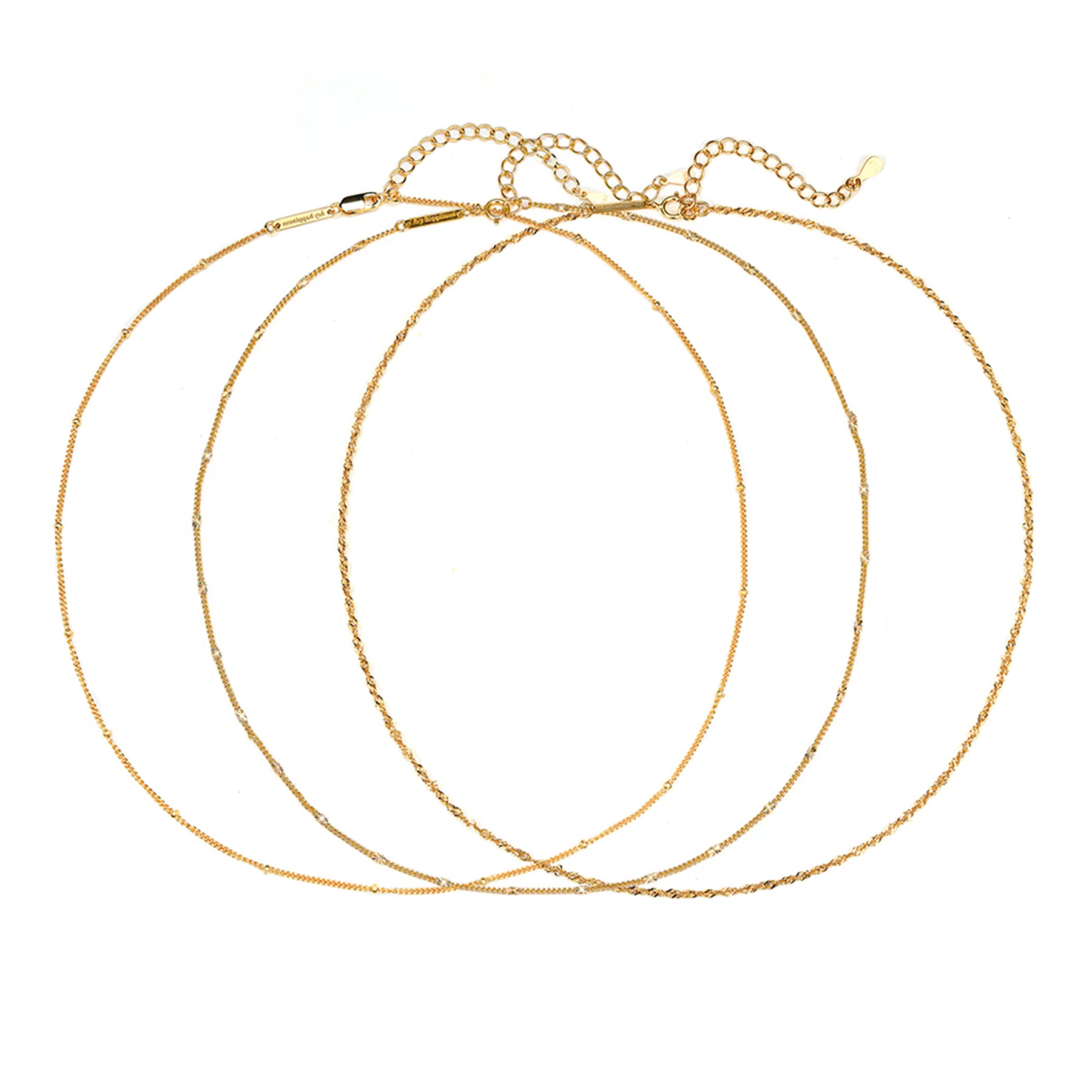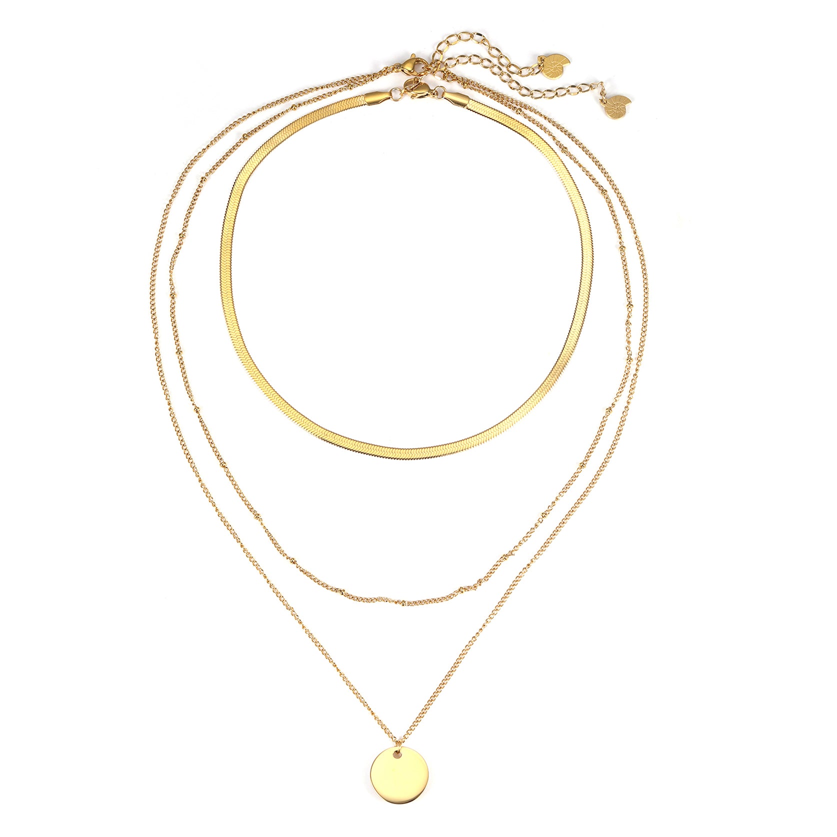 We have sets of several multi-layered necklaces in different styles designed to be worn at different heights—choker necklaces worn together with longer chains with pendants; thicker necklaces made from snake chain worn with delicate, fine chains; and single-stranded chains paired with lariat necklaces. These multi-layered necklace combinations always produce a unique look and are right on trend this season.