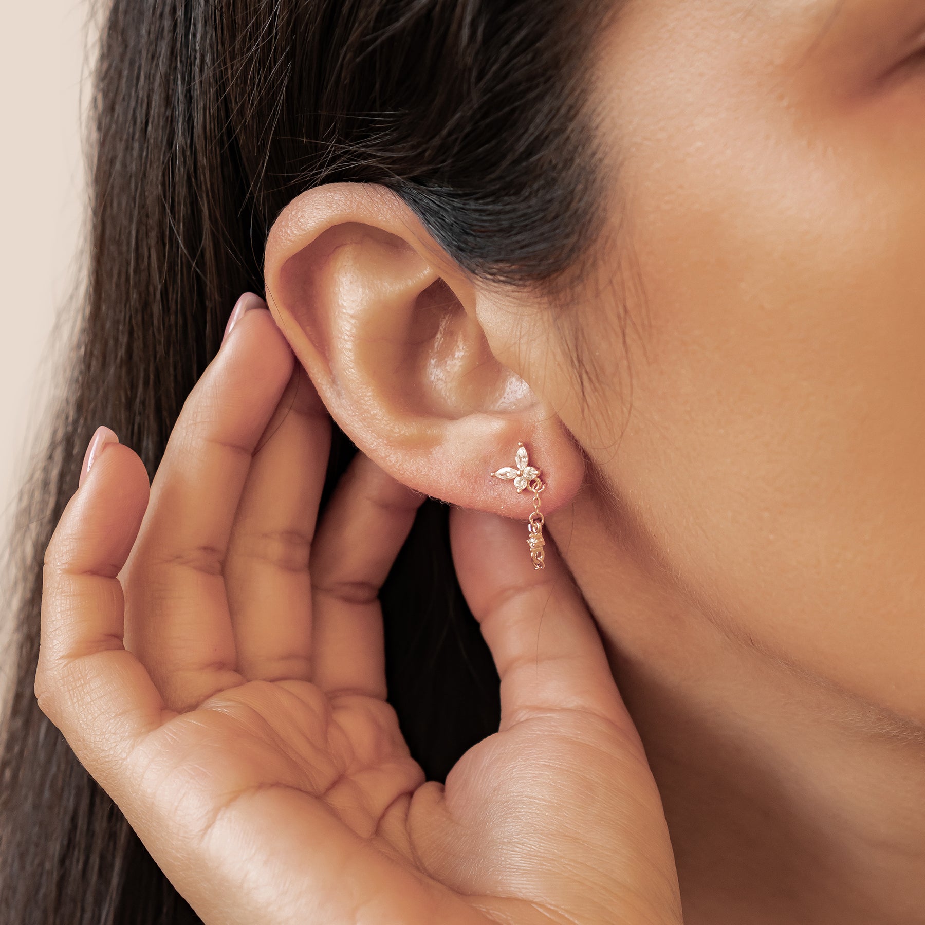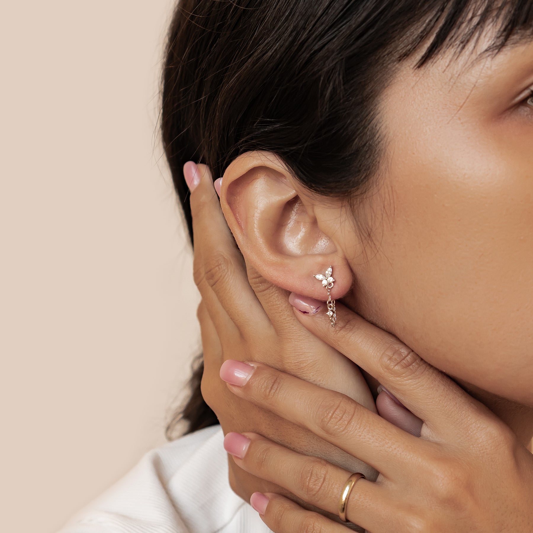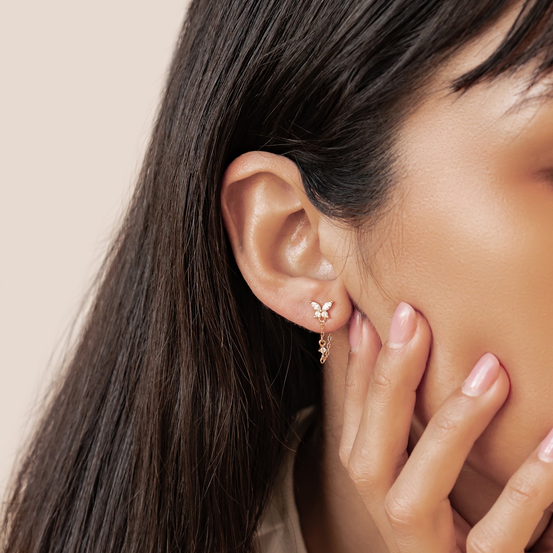Zart und anmutig – diese Ohrringe zeigen funkelnde Zirkonia-Steine in Form von Schmetterlingsflügeln, die für Schönheit und Veränderung stehen. Zwei feine Ketten verleihen dem Design eine elegante Bewegung und fangen bei jeder Drehung das Licht ein. Gefertigt aus 925er Sterling Silber und wahlweise mit 18K Gold, 18K Roségold oder Silber veredelt, sind sie hypoallergen und perfekt für den Alltag oder besondere Anlässe geeignet.