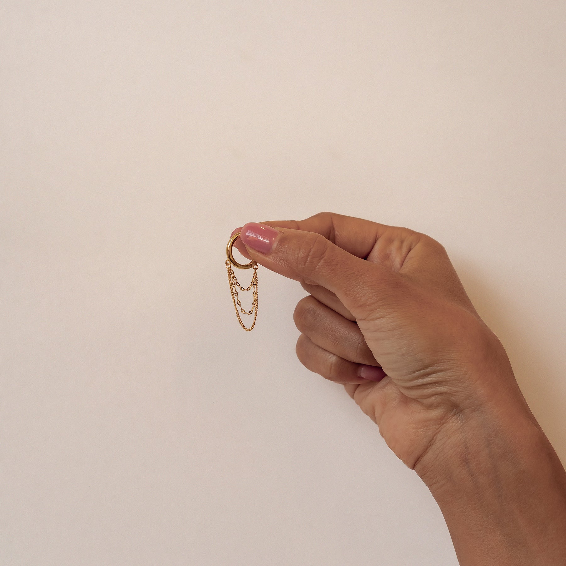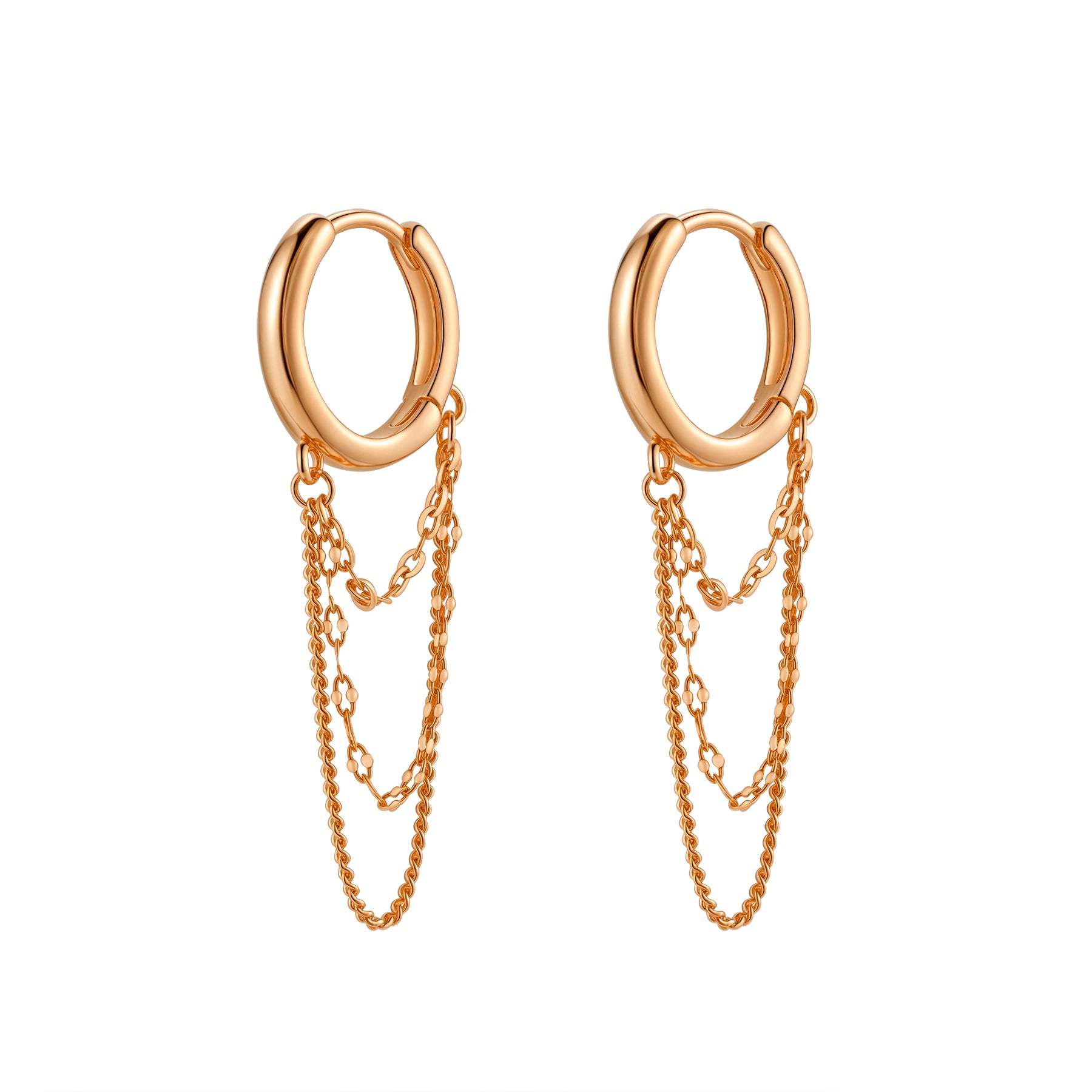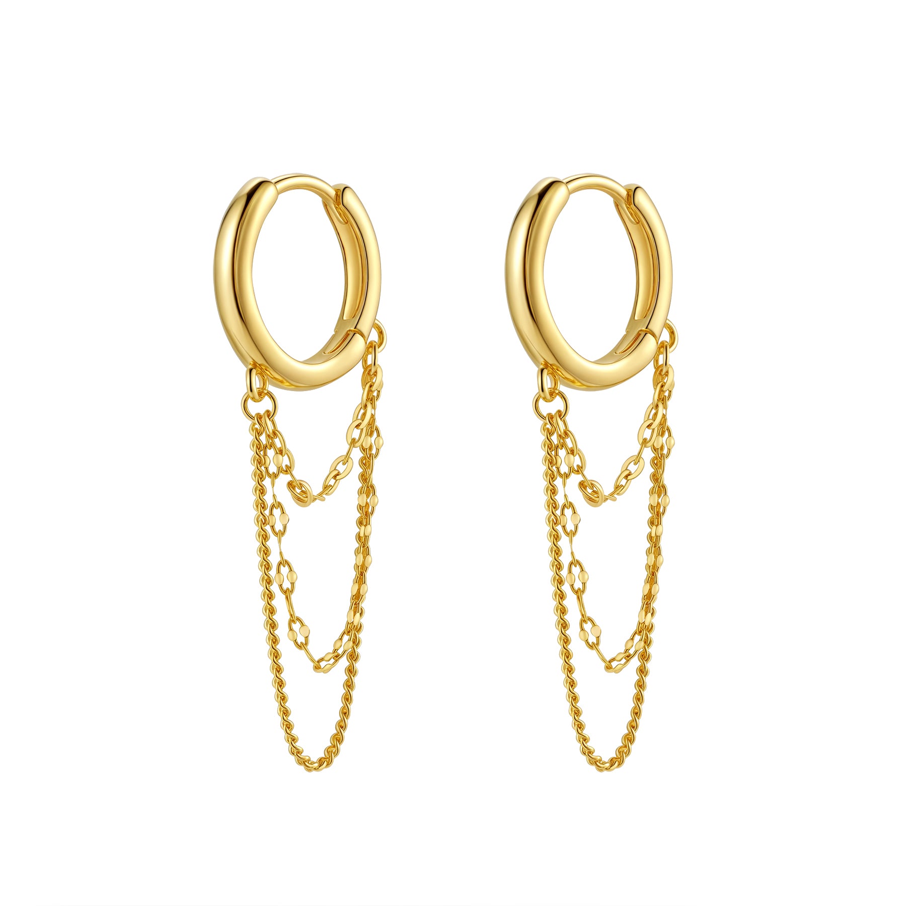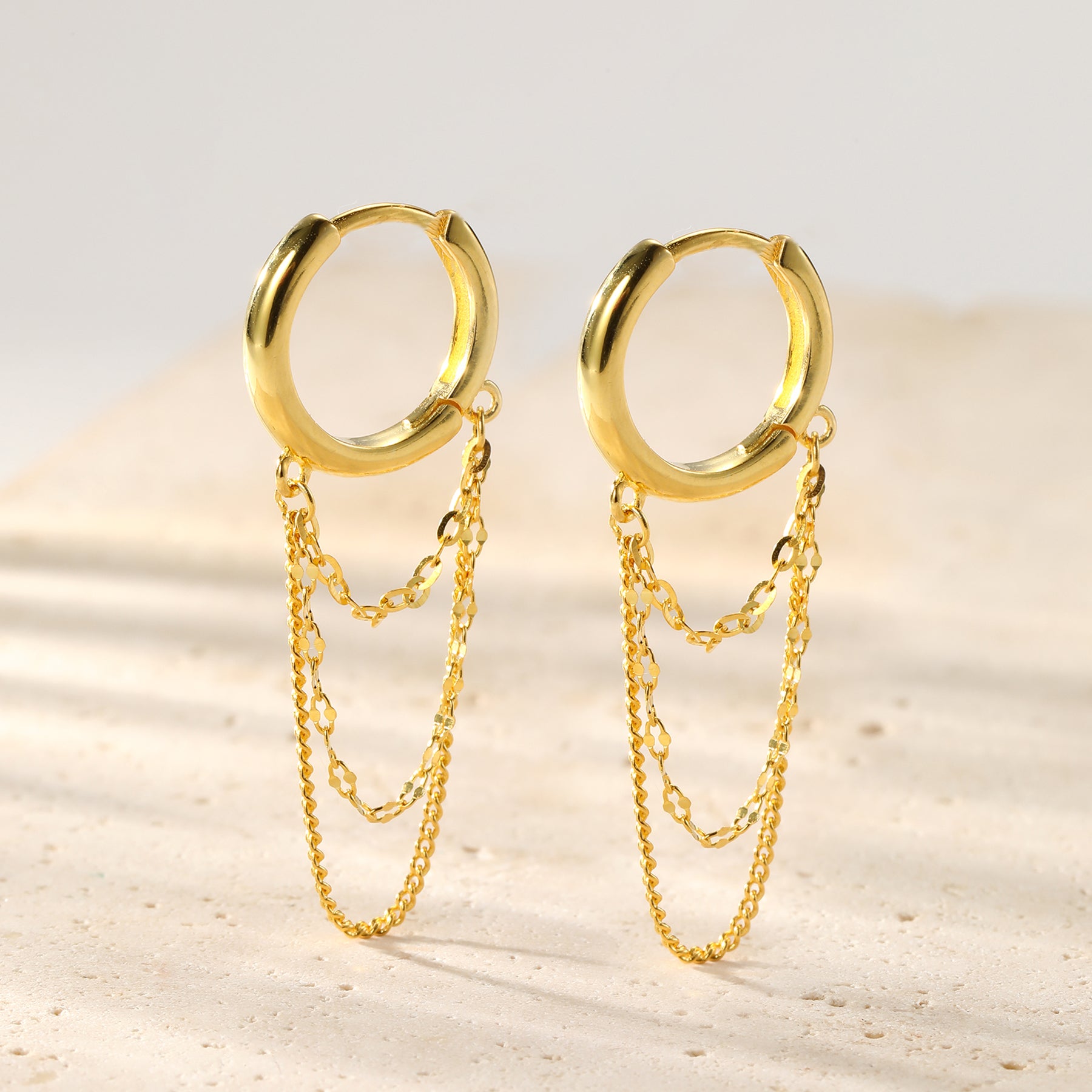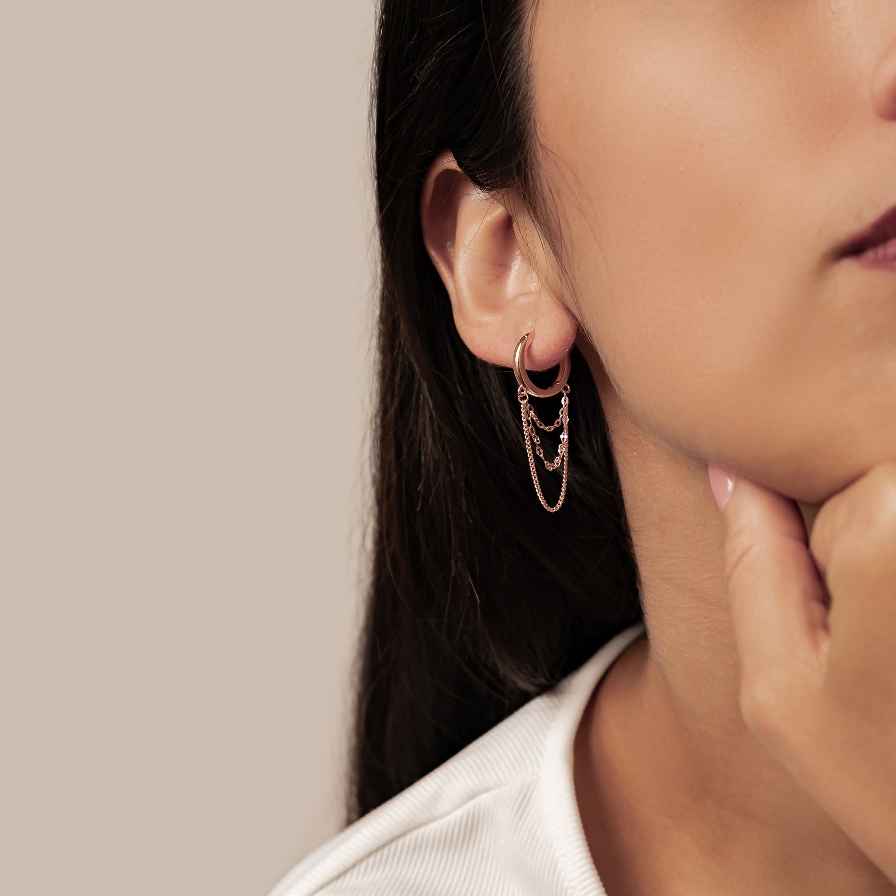 Für moderne Eleganz entworfen, zeigen diese schlanken Creolen drei herabfallende Ketten, die eine fließende und anmutige Silhouette schaffen. Gefertigt aus 925er Sterling Silber und erhältlich in Gold, Roségold und Silber – sie verleihen jedem Look eine subtile Raffinesse und elegante Bewegung.