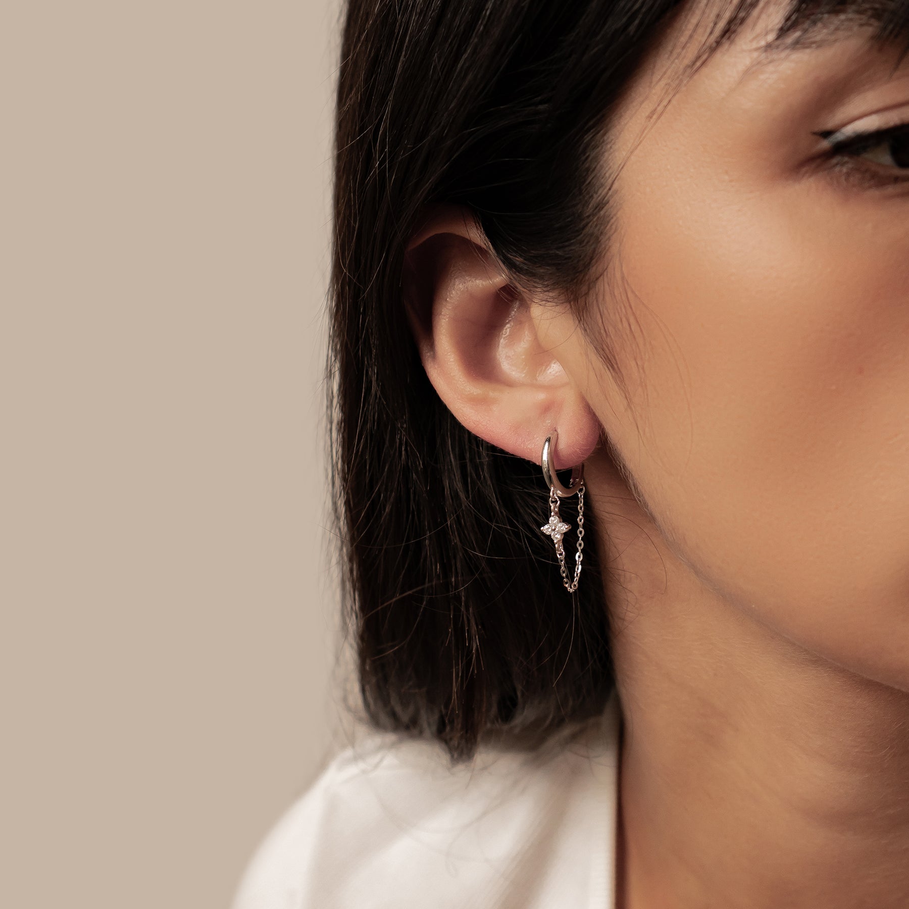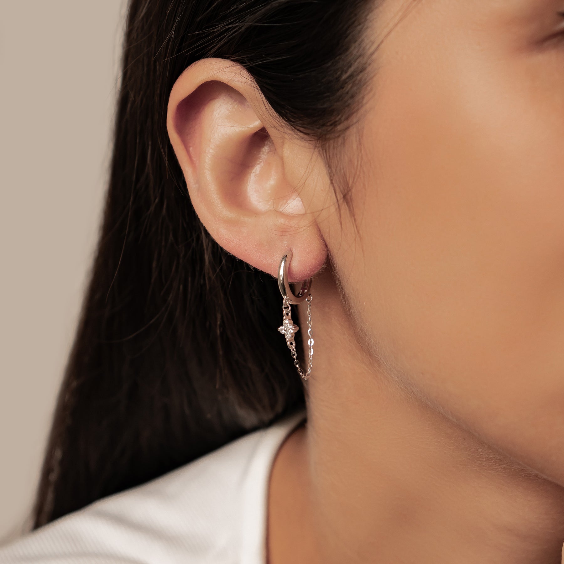 Ein minimalistischer Creolen-Ohrring trifft auf einen funkelnden Blütenanhänger, verbunden durch eine feine Kette, die sanfte Bewegung und dezenten Glanz verleiht. Elegant und vielseitig – gefertigt aus 925er Sterling Silber und erhältlich in Gold, Roségold und Silber. Perfekt zum Kombinieren oder als stilvolles Einzelstück.