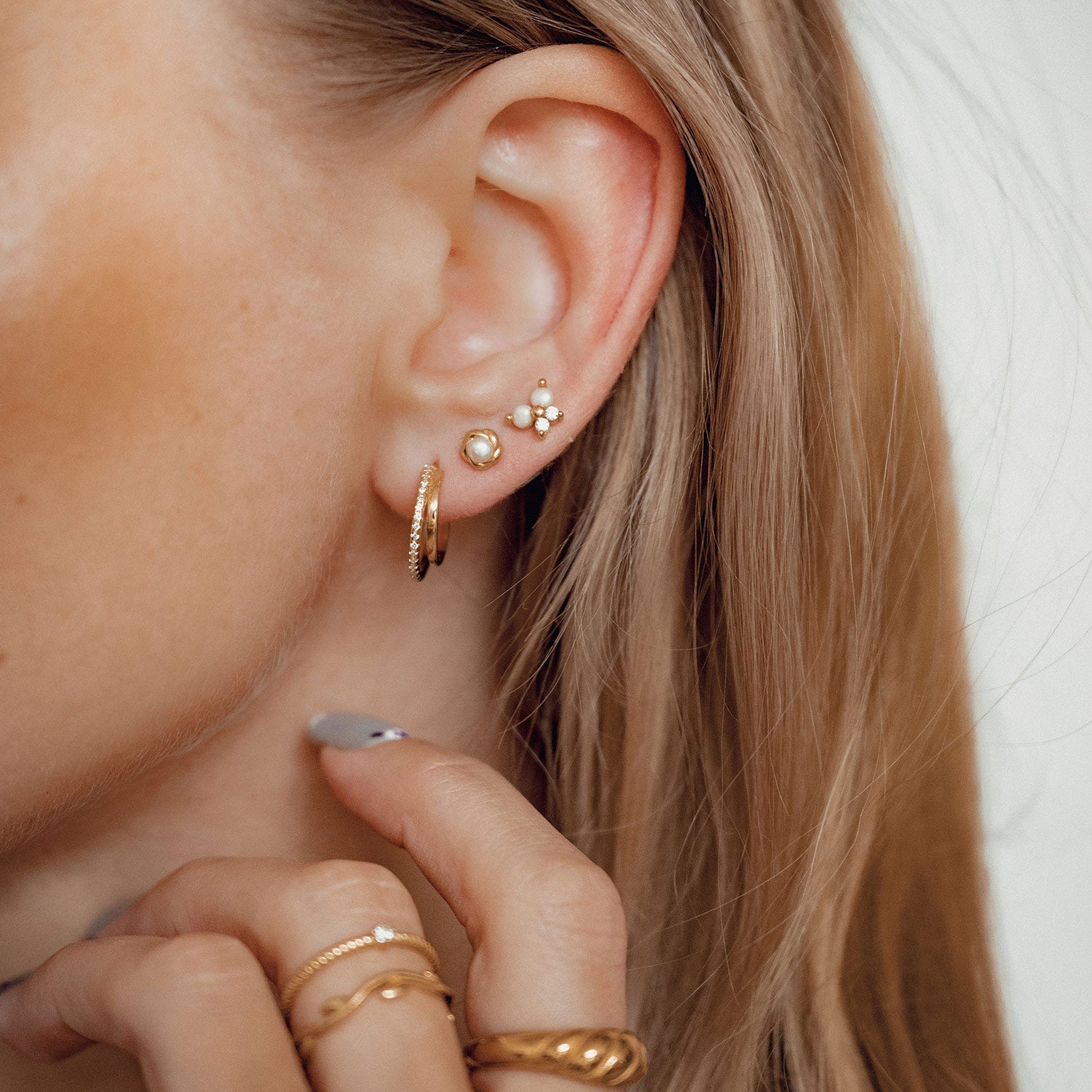 Round Pearl Charm Hoop, Trio Pearl Bar Studs & Pearl Chain Studs by Hey Happiness