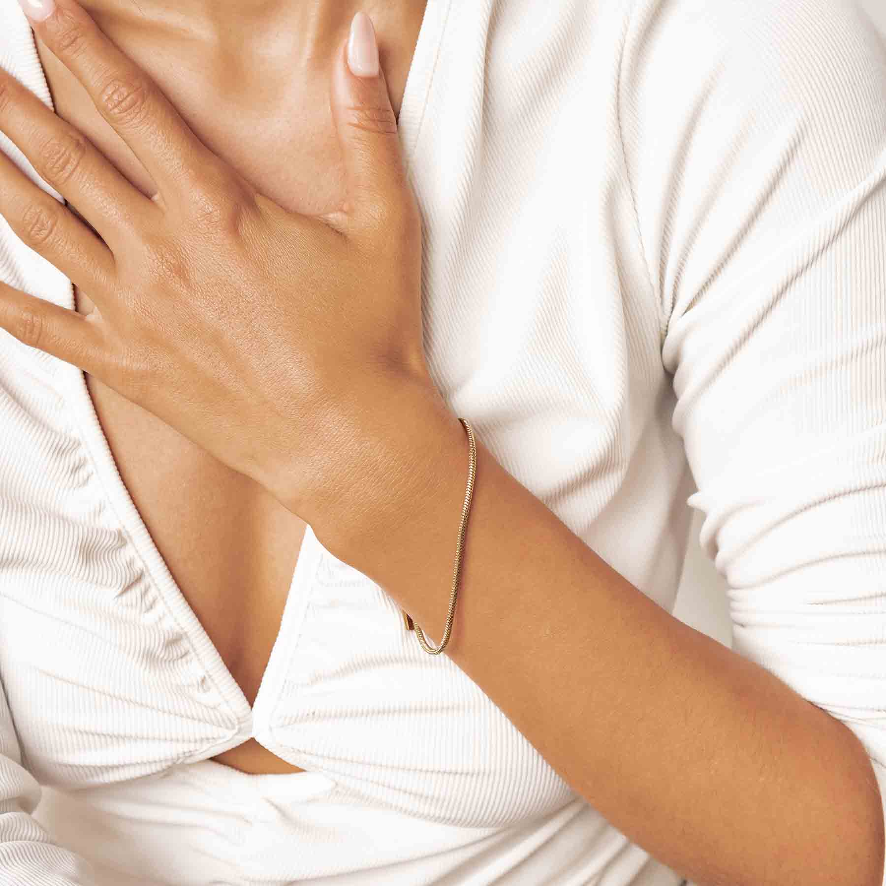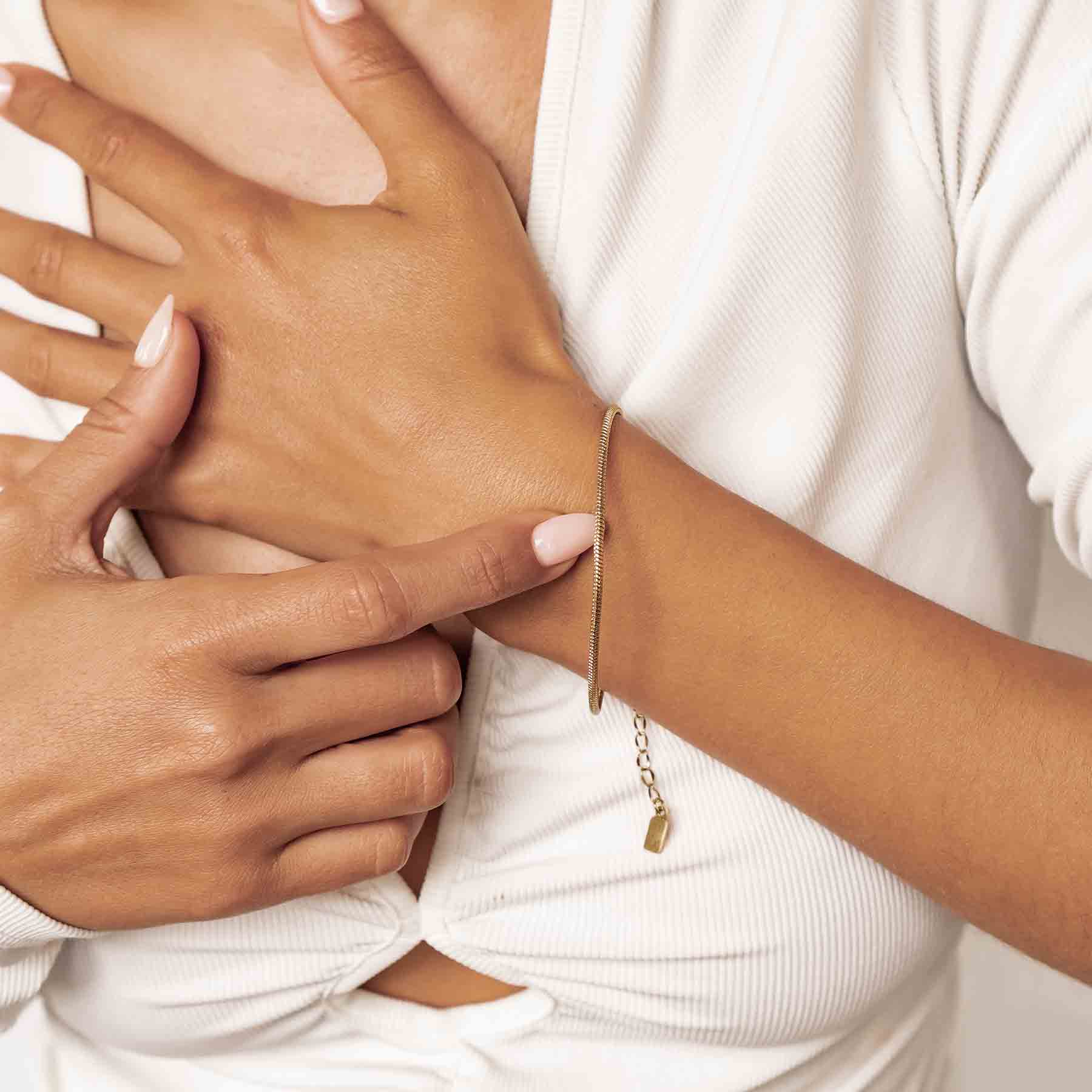 Una pulsera redondeada de la cadena de "serpiente", hecha de acero inoxidable, cubierto con oro de 18 quilates y terminada con extremos de engarzado. Se sujeta con un broche de "garra de langosta" en forma de ovalado y tiene una cadena de extensión corta con una firma Hey Happiness colgante de concha para un ajuste ajustable. Una pieza fuerte, flexible y muy versátil. Echa un vistazo también Brazalete de Cadena Serpiente en Oro.