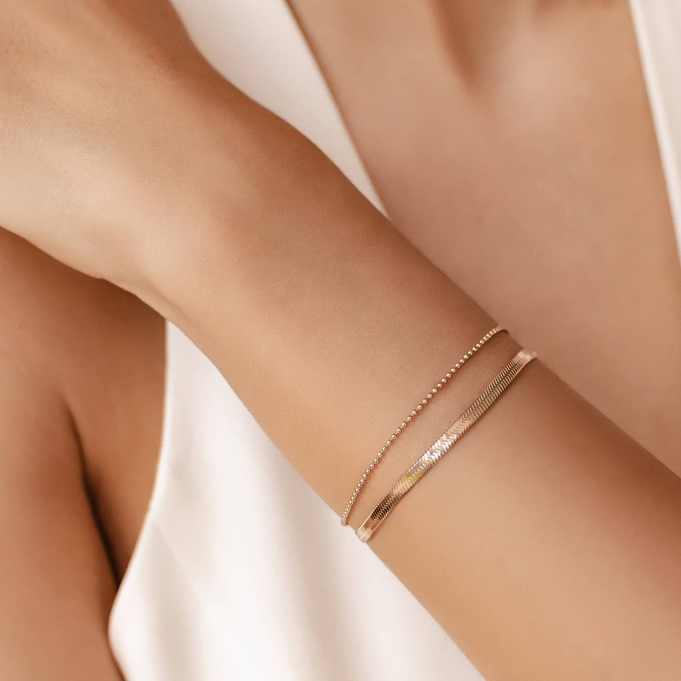 Eleve sin esfuerzo tu juego de muñeca con nuestro conjunto de pulseras de cadena de serpientes y cuentas. Hecho a mano de acero inoxidable premium, este conjunto incluye dos pulseras. Disponible en oro, oro rosa y plata. Incluye: