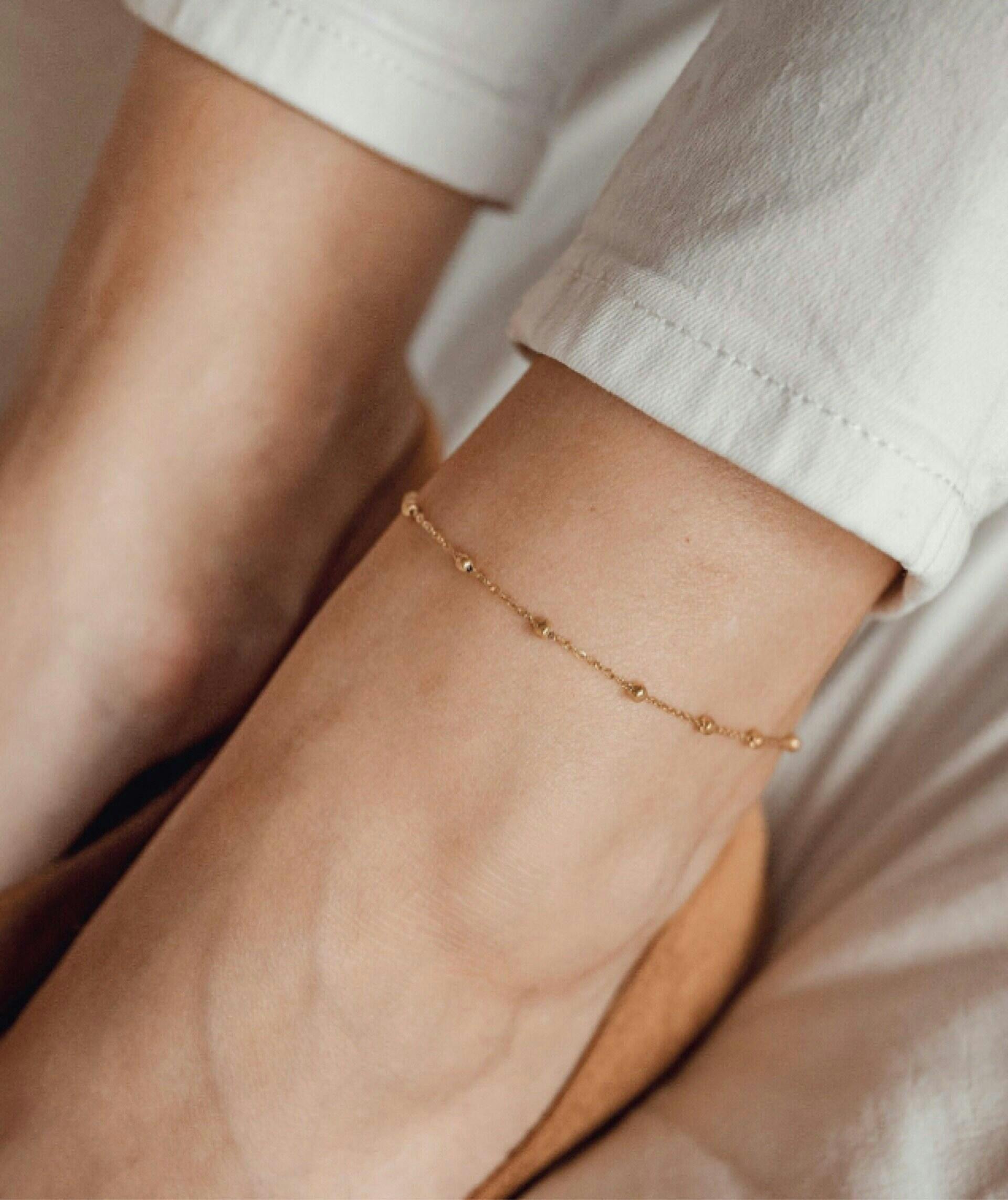 This delicate anklet is made from rose gold-plated stainless steel and features tiny oval-shaped chain links, 11 metallic rose gold beads inserted all the way around, and an oval-shaped spring clasp to fasten. It also has a short extension chain with a small shell charm which allows you to find your perfect fit. A versatile and classic design that will pair well with any outfit. Also check out Circles Bobble Chain Anklet Rose Gold.