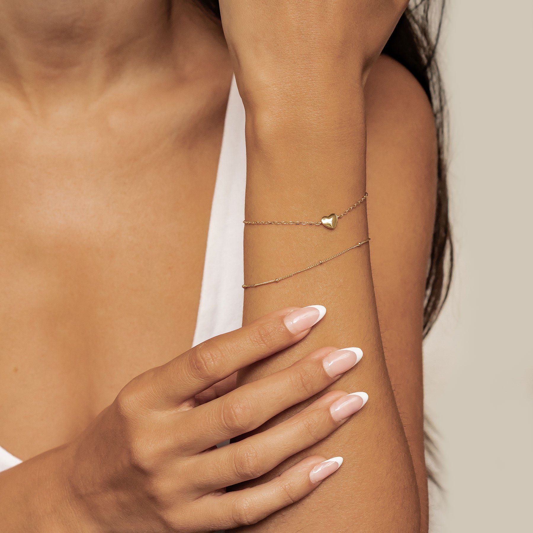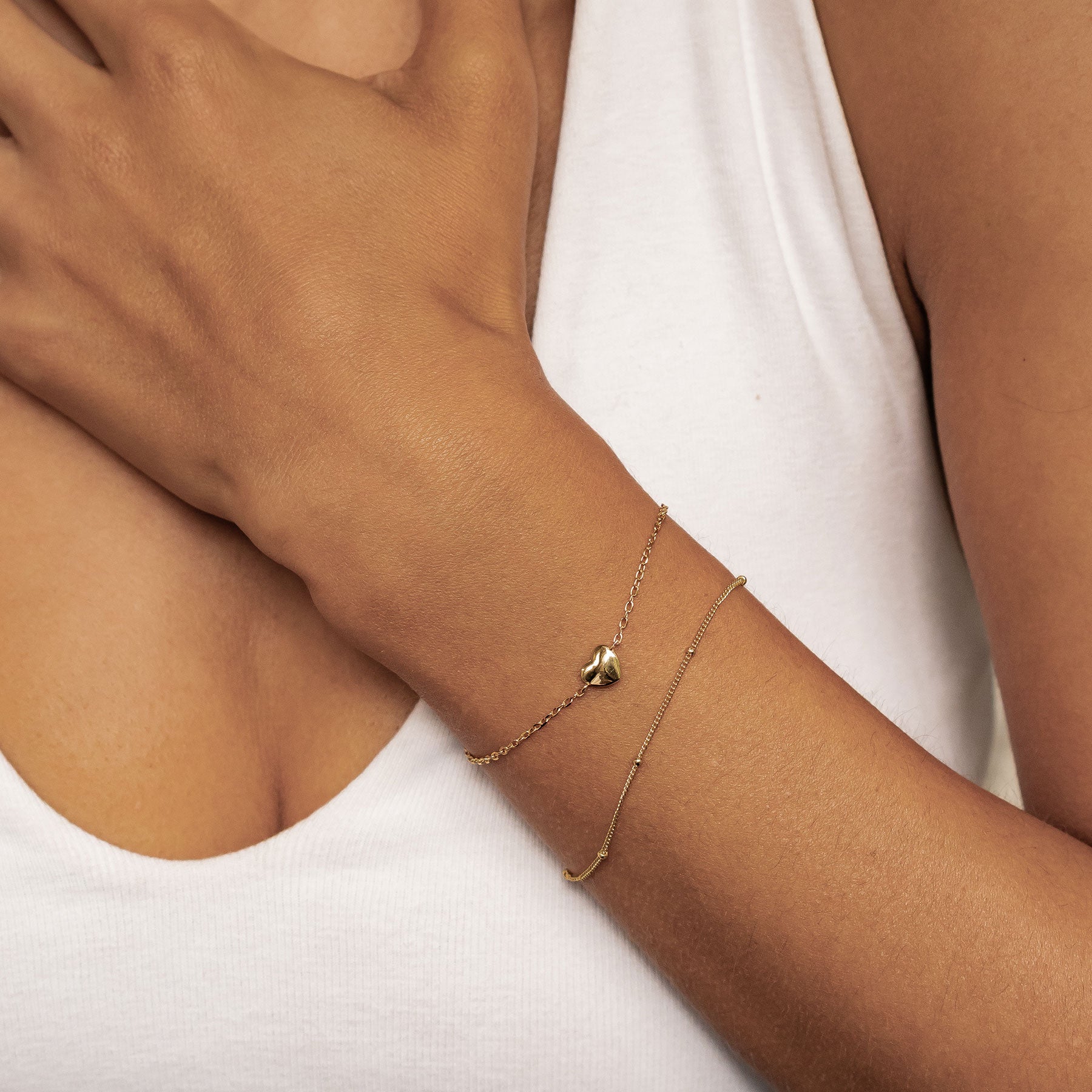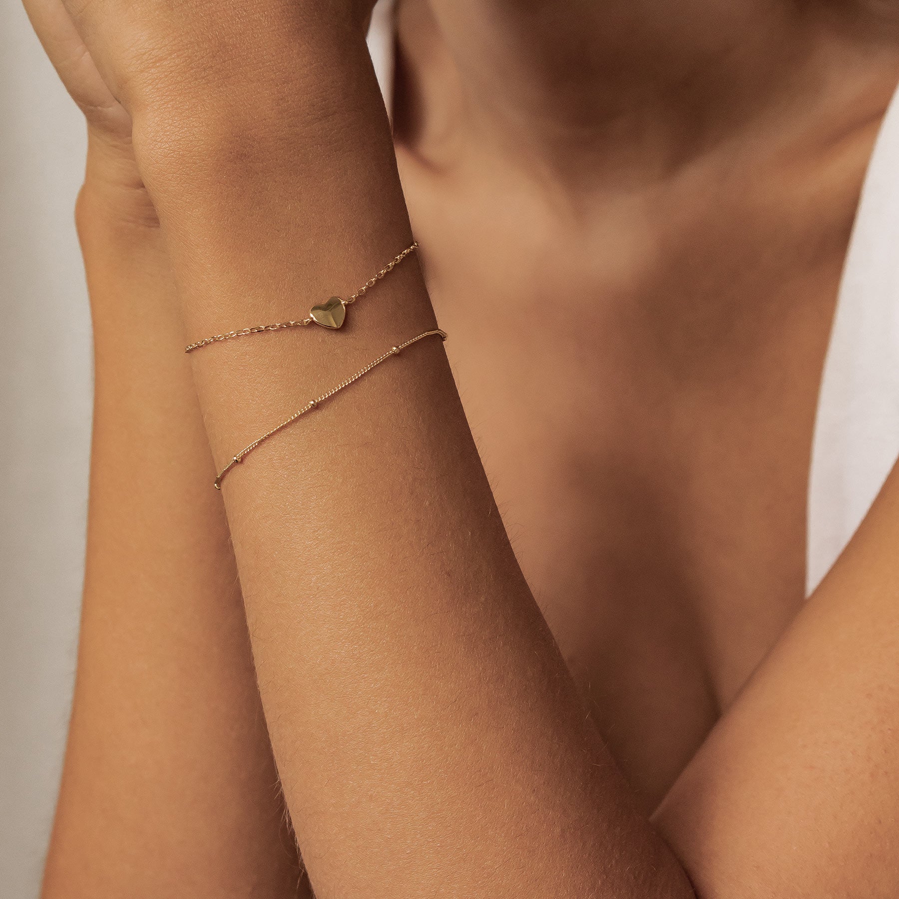 Romantic and dainty, the Double Chain Heart Bracelet features two fine sterling silver chains. Available in gold and silver, this bracelet layers effortlessly with other styles while making a sweet statement on its own. A timeless piece that symbolizes love and connection.