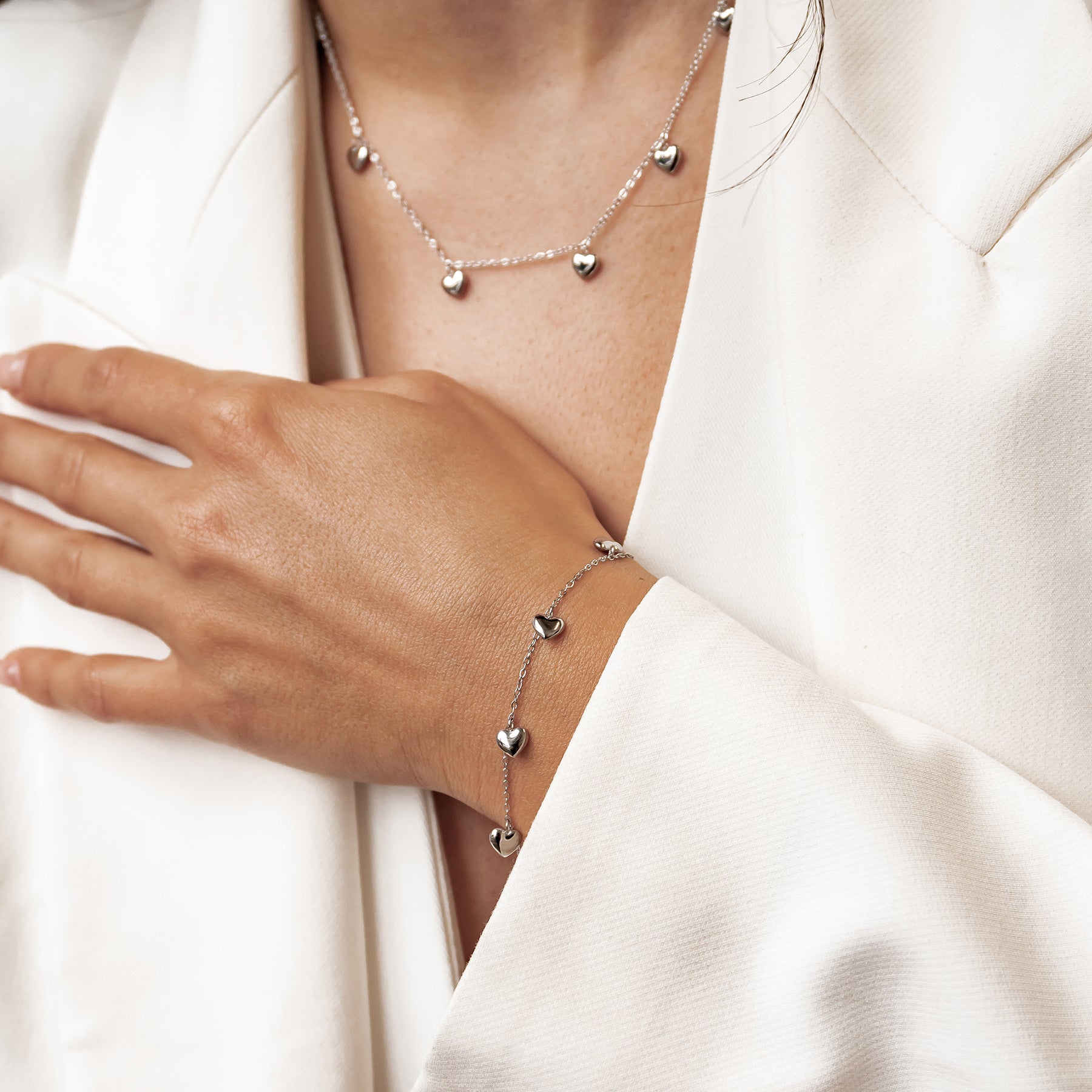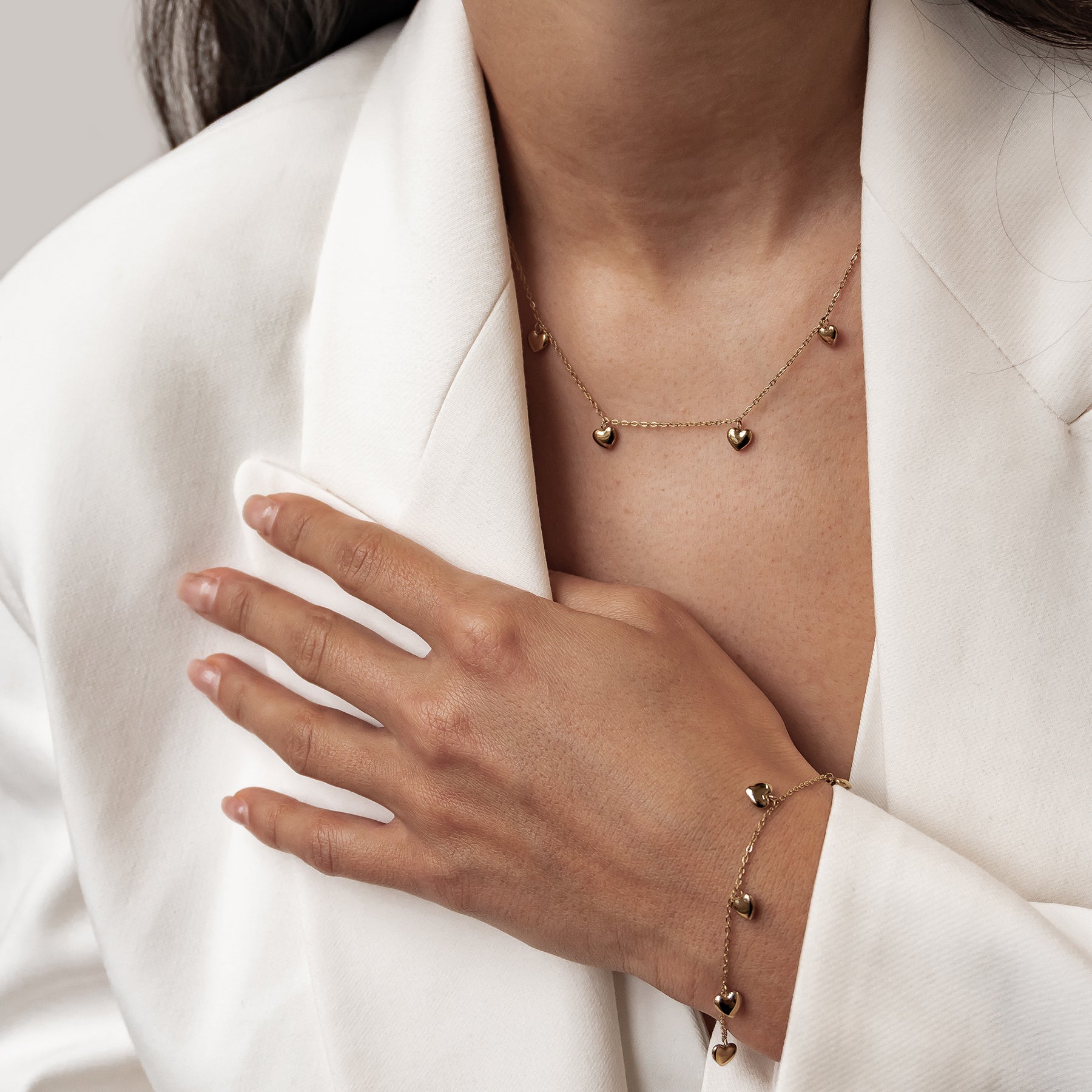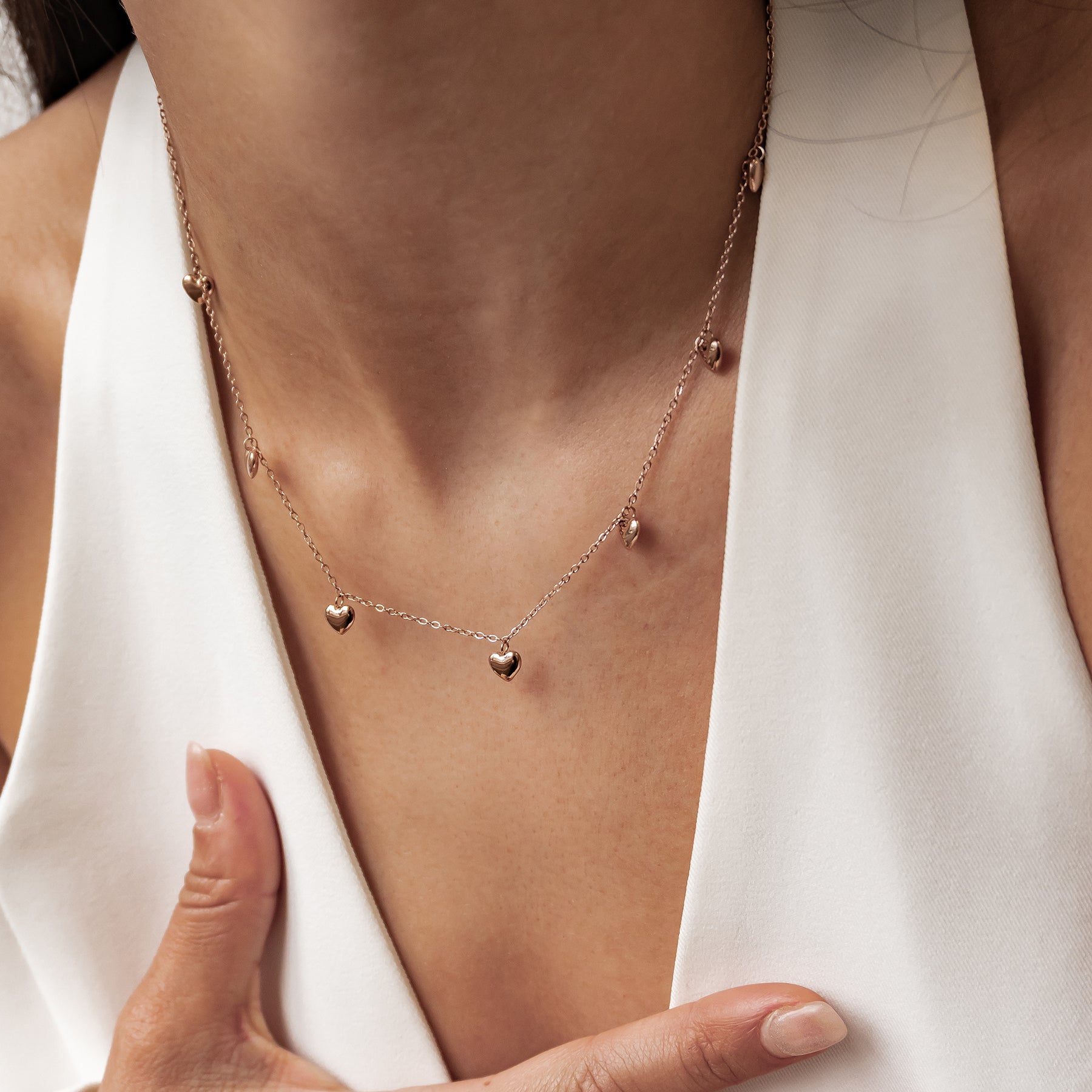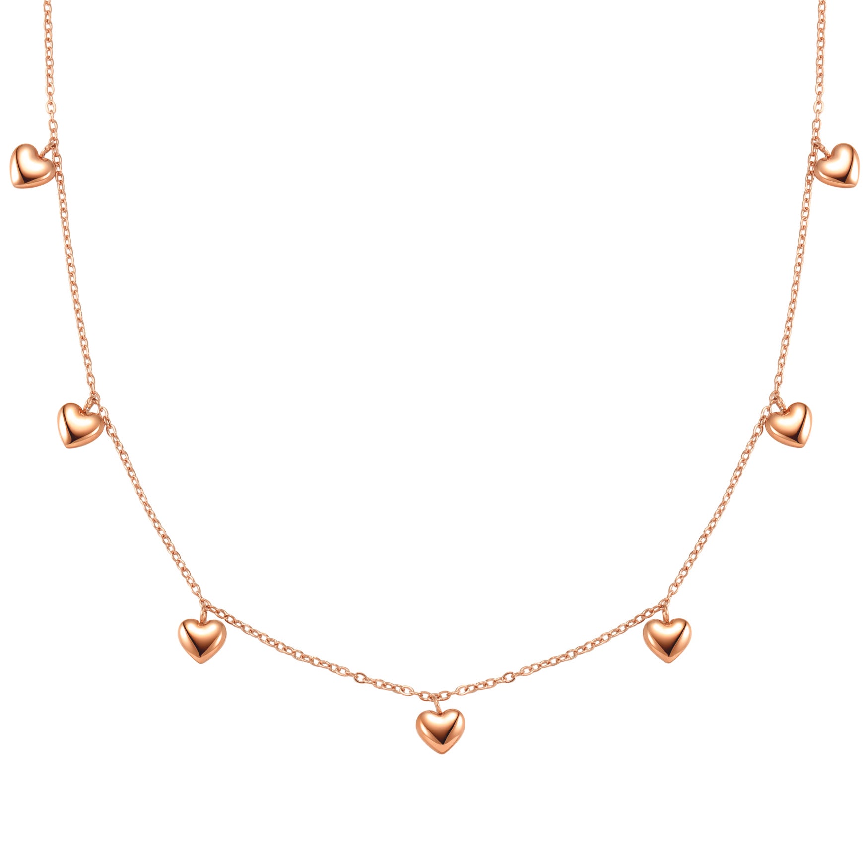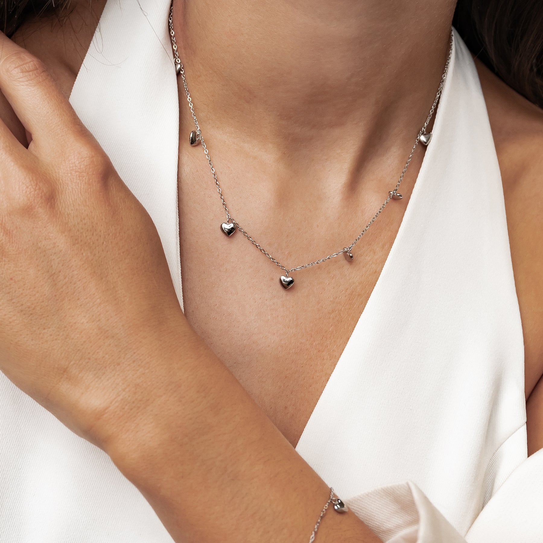 This necklace is an eye-catching piece, featuring several chunky heart pendants delicately arranged along the chain. Made from high-quality stainless steel, it comes in gold, rose gold, and silver finishes, offering a luxurious look that complements any style. Waterproof for practicality, this necklace adds a playful yet refined element to your outfit, making it a must-have for those who love bold yet timeless jewelry.