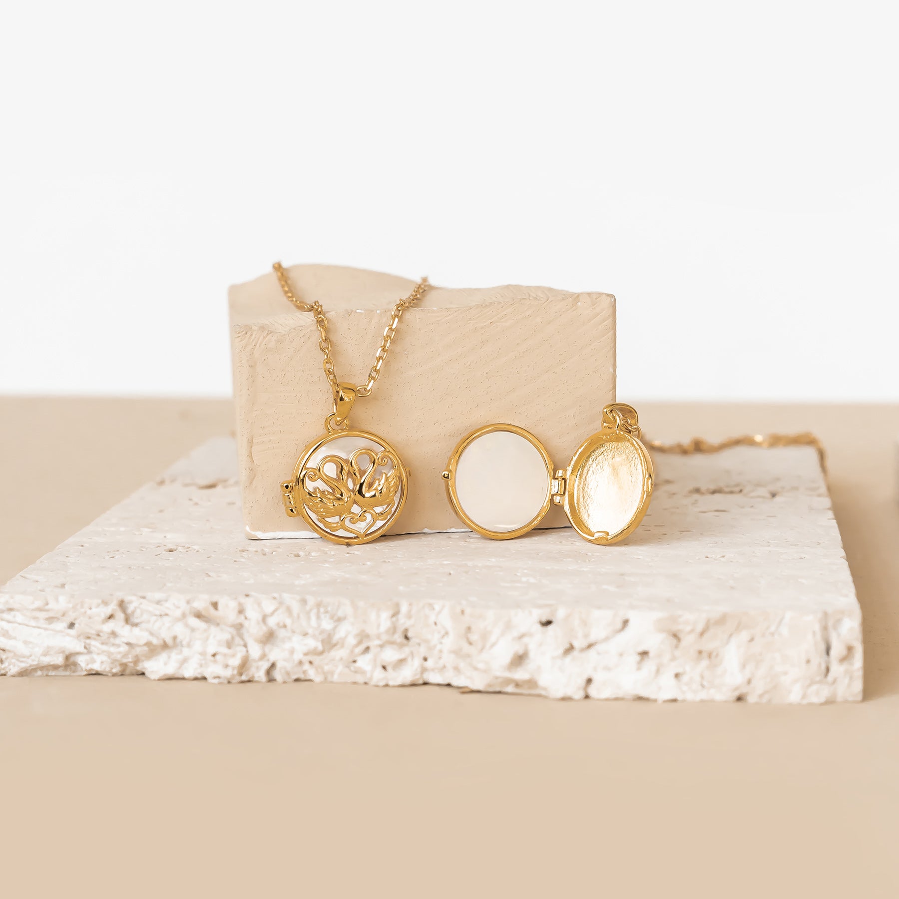 Celebrate eternal love with this twin swan locket necklace. Designed in 925 sterling silver and available in gold, rose gold, and silver, the pendant features two graceful swans forming a heart, symbolizing unity and romance.